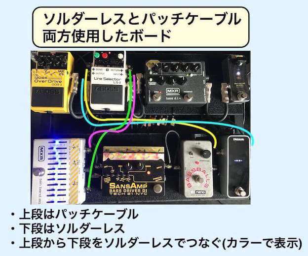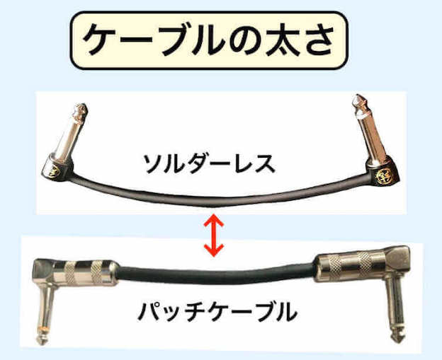 プロのエフェクターボードではソルダーレスケーブルが主流になってきています。