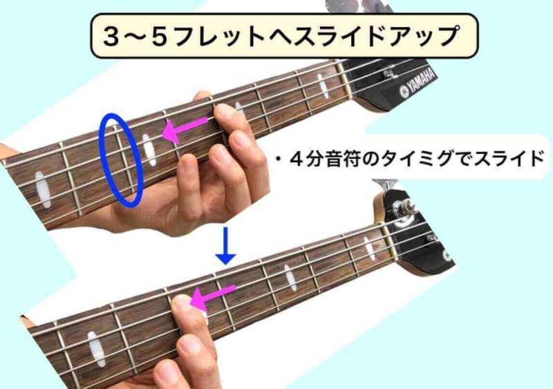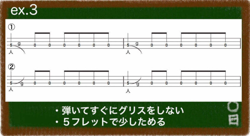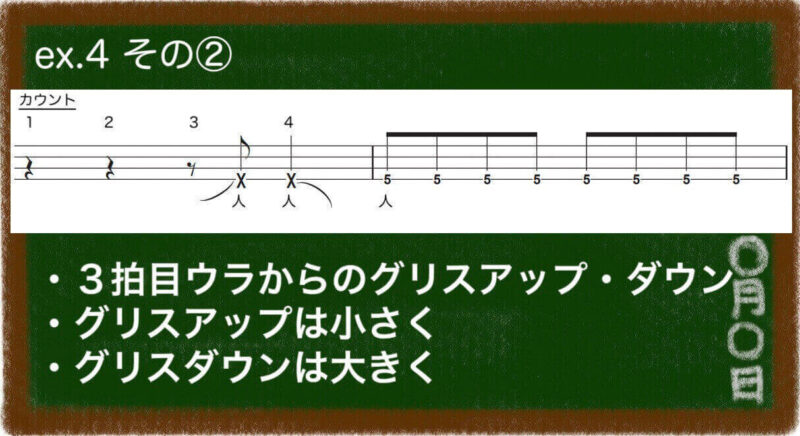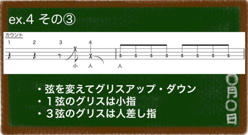 ・4拍目で3弦に乗せかえてグリスダウン(人差し指)