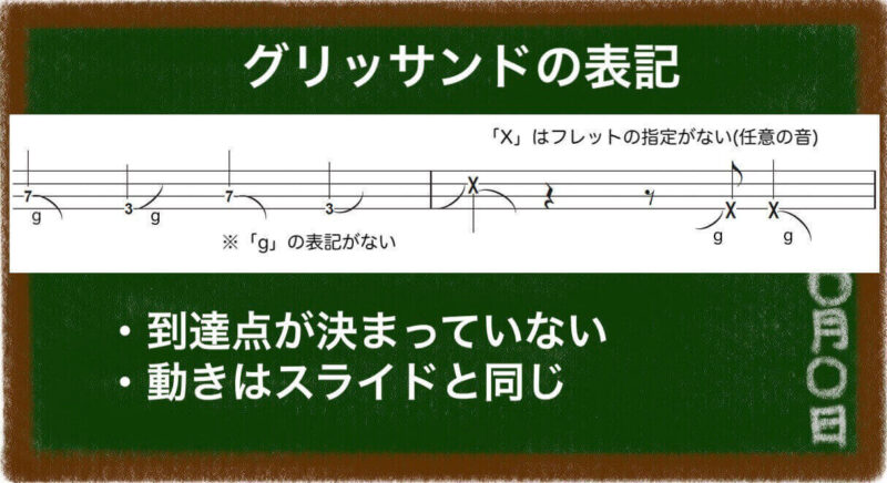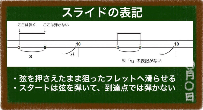 ただ、筆者は「スライド」「グリッサンド」を区別して弾いていません。