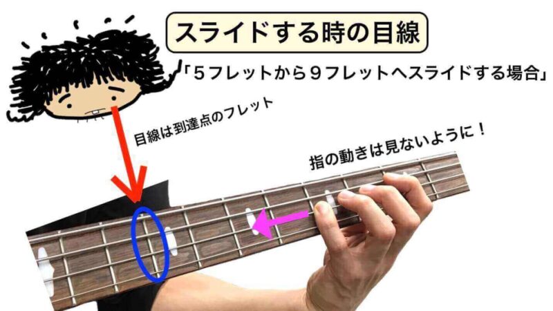 スライドする手の動きを目で追ってしまうと、到達するフレットがずれてしまう。。