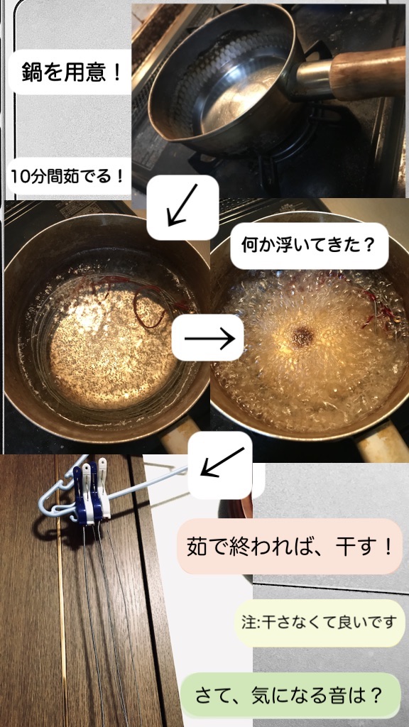 先ほどのベース弦を茹でる!「鍋の用意」「10分間」「グツグツやる」「乾かして張り直す」