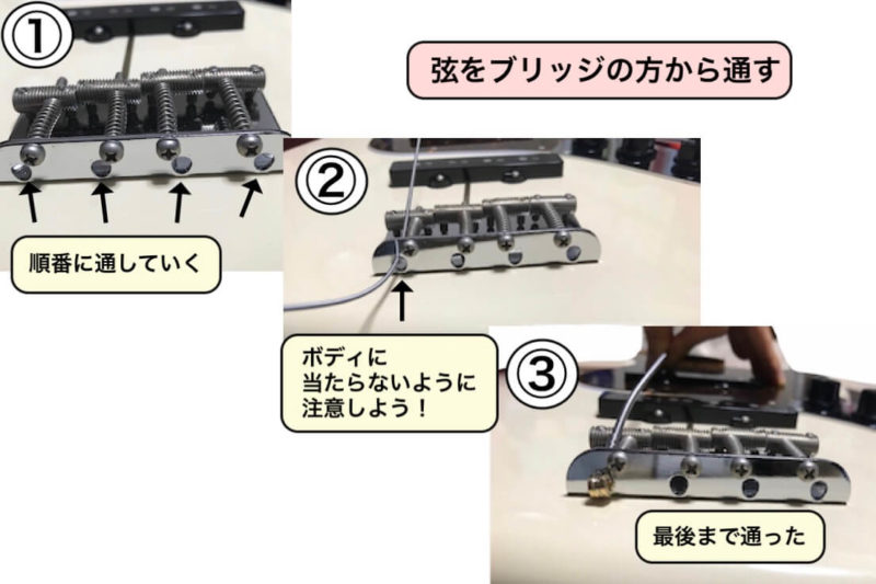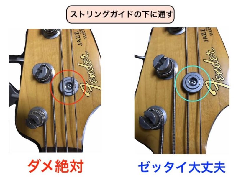 「ストリング・ガイド(写真参照)」がある場合は、この下に1弦2弦を通します。