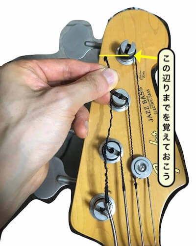 4弦だと、だいたい3つ目のペグ手前までですね。