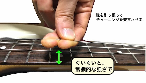 ②12フレットあたりをぐいぐいと2〜3回引っ張ります(写真参照)