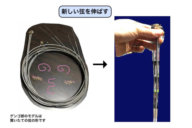 もともと張ってあった古い弦をペグから外して、引き伸ばす(写真参照)