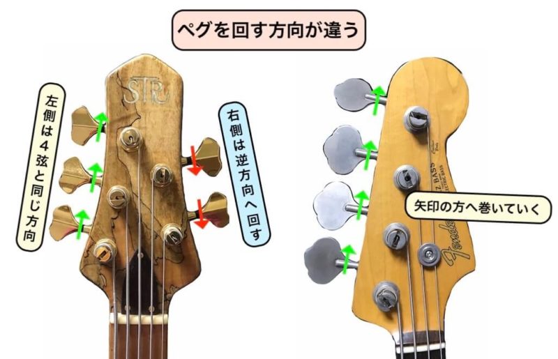 この場合、右側のペグは逆に回して弦を巻いていくんだ♪