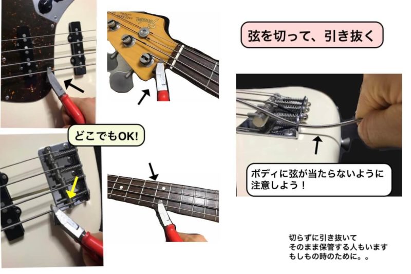 切った弦を引き抜く時:弦がボディに擦れないように注意!