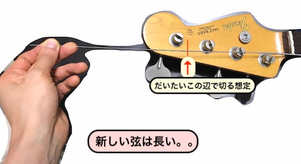 新しい弦は伸ばすと結構長いので、適当な長さで切ります。