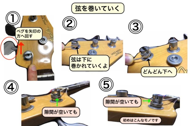 4弦に比べ1弦の方が負荷が少ないという理由で、負荷が弱い1弦から巻いていきます。