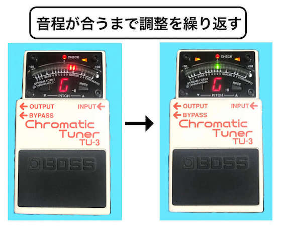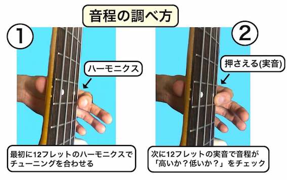 ①1弦12フレットのハーモニクス(開放弦でもOK)を「ソ(G)」に合わせる