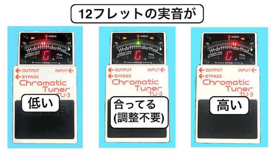 ・再び、ハーモニクス(開放弦)と12フレットの実音をチューナーでチェック