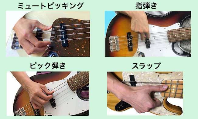 指弾き,ピック弾き,スラップ奏法と比較して聴いてみましょう♪