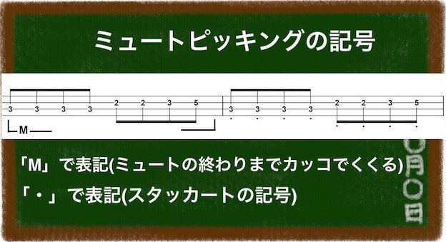 ・数字の下に”M”を表記しミュートピッキングの終わりまでカッコでくくる