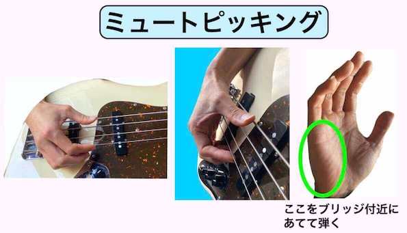 ミュートピッキング:手のひらをブリッジ付近に当てて親指で弾く奏法
