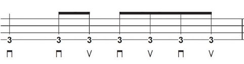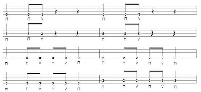 3拍目オモテ・ウラで同じフレーズ(2弦・3弦)