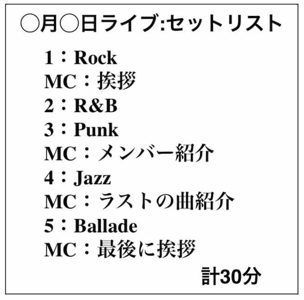 など未知数が多いので、まず30分のライブを目指すことをお勧めします。