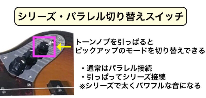 ・トーンノブを引っぱるとピックアップが直列になりパワフルなサウンドに切り替わ