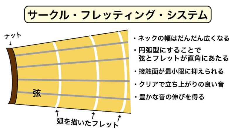フジゲンベースの特徴として知っておきたいのが「サークル・フレッティング・システム」