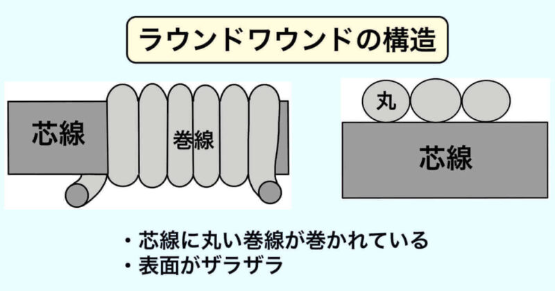 「ラウンドワウンド弦」「ラウンド弦」は芯線に丸い巻き線を巻いた構造。