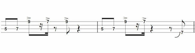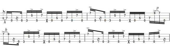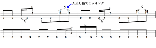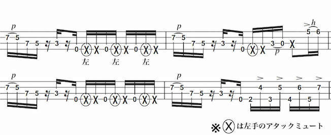 ※譜例は自身の教則ビデオで実演していたバージョンで、オリジナルとはフレーズが異なります。