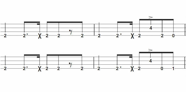 その際にバスドラム替りに低音弦を親指で叩き(サムピング)、スネア替りに高音弦を引っ張って音を出した(プル)。
