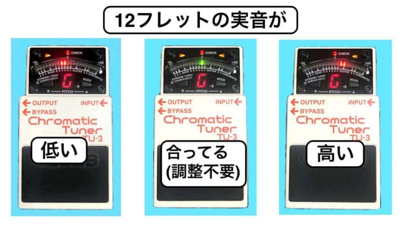 ・再び、ハーモニクス(開放弦)と12フレットの実音をチューナーでチェック
