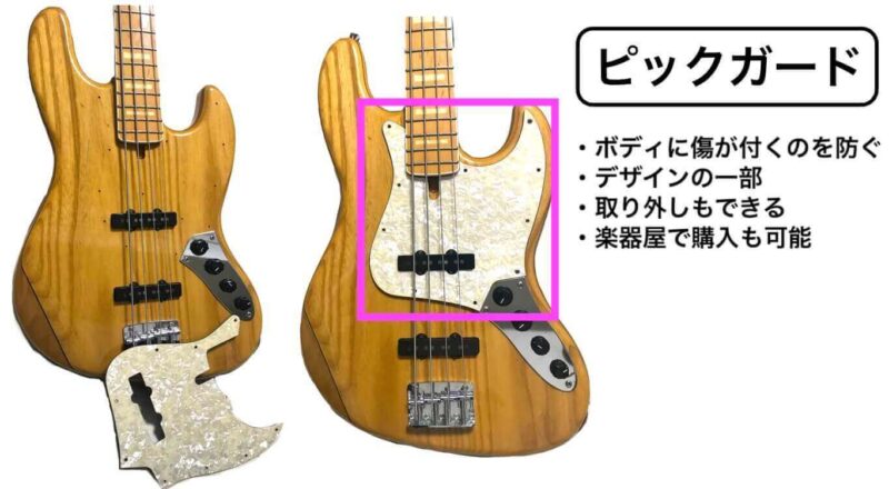 ピック弾きのとき、ベースのボディに傷が付かないようにするためもの。