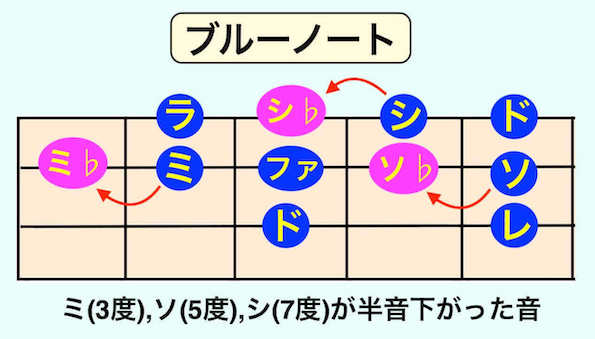 「ドレミファソラシド」の「ミソシ」を半音下げた「ミ♭, ソ♭, シ♭」がブルーノート