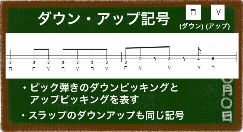 ピック弾きの「ダウン」「アップ」を示す記号があります。