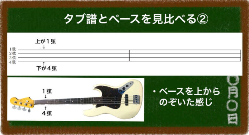 ベースを構えたとき、タブ譜と弦が上下逆になるわけね。
