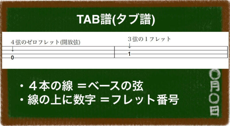 ・タブ譜:線の上に数字を書いて、ベースのどこを押さえて弾くかを示した譜面