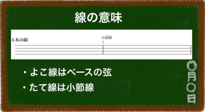 このタブ譜には、4本の線(よこ線)が書かれています(写真)