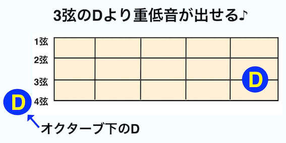 ・3弦のDよりオクターブ下のDが出せる=重低音が出る