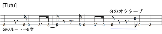 ・3小節目の2弦5フレットはオクターブ上の”G”